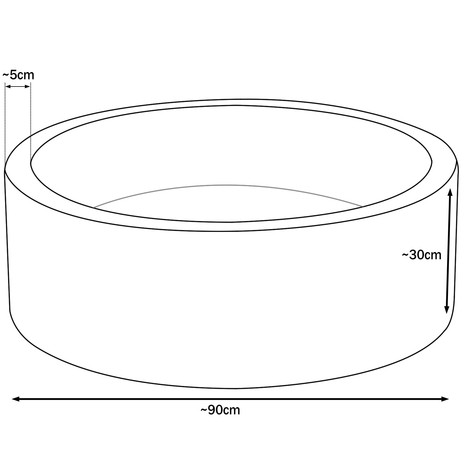 Maße: 90 cm Durchmesser, 30 cm hoch, 5 cm dick, Boden 2 cm